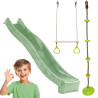 Zestaw wyróżnia się wszechstronnością i funkcjonalnością – łączy ślizg, trapez i linę wspinaczkową, oferując różnorodne formy aktywnej zabawy w jednym produkcie. Wspiera rozwój koordynacji, równowagi i siły, jednocześnie angażując dziecko do ruchu każdego dnia.