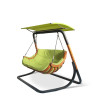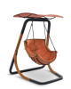 Ogrodowy fotel wiszący na stelażu może być dodatkowo wyposażony w daszek, który chroni przed słońcem.