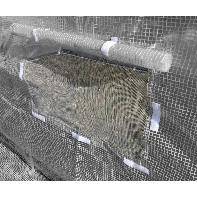 Dane użytkowe: 1 drzwi zwijane zamykane na gruby, solidny zamek błyskawiczny 8 okien 50x37 cm umożliwiających wietrzenie i termoregulację, zabezpieczonych moskitierą oraz opuszczaną zasłoną Szeroki (20cm) kołnierz / fartuch ziemny, po przysypaniu ziemią zapobiega podwianiu pokrycia.